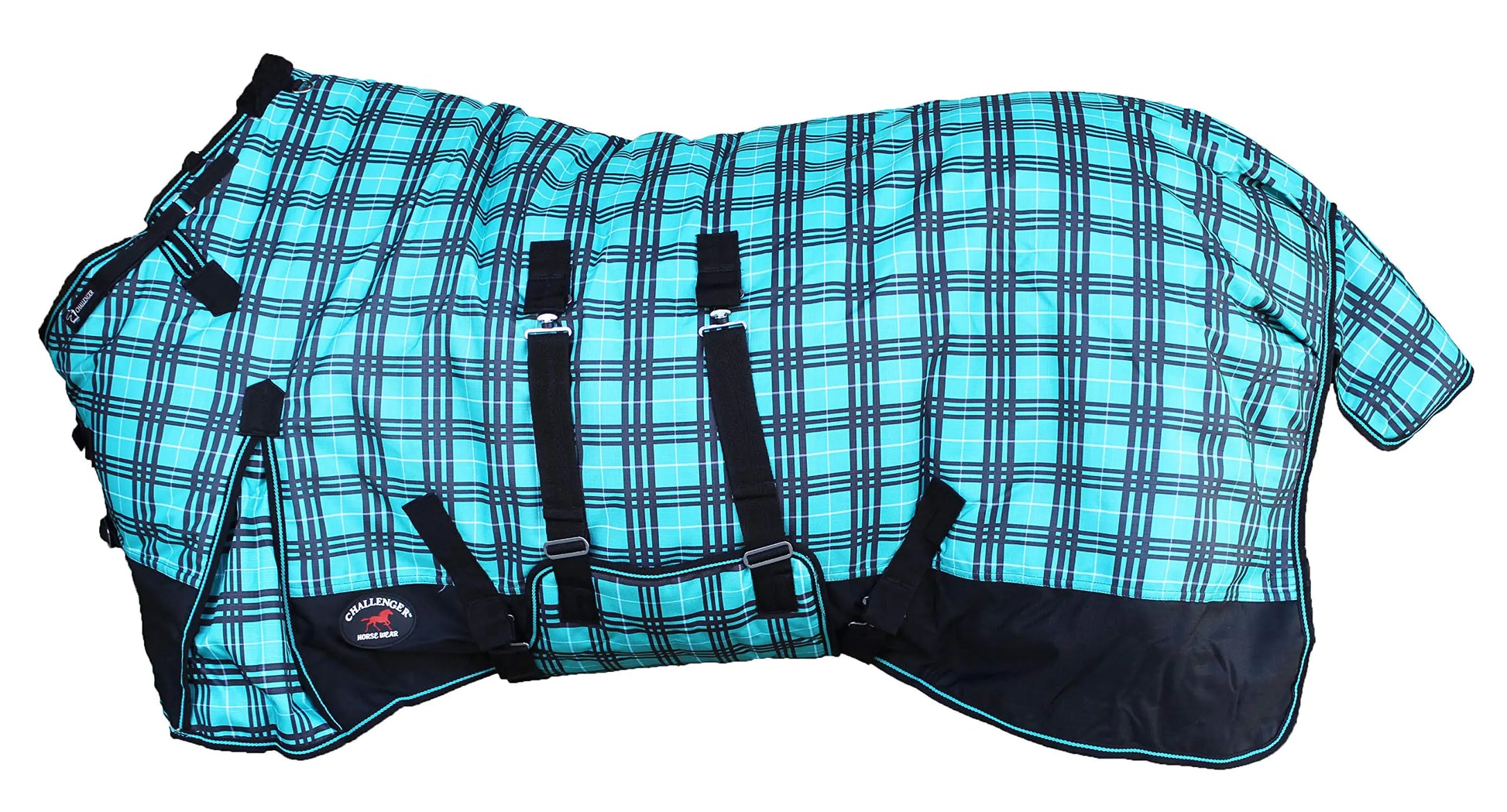 The Challenger 1200 Denier turnout winter blanket is designed with a durable rip-stop waterproof, windproof, and breathable polyester outer shell alongside a 210 denier lining. It contains 400 grams of polyester insulation to provide excellent warmth and dryness for your horse during cold weather. The blanket includes an adjustable double buckle front with a snap closure, cross surcingles, neck adjustment, and elastic leg straps to ensure a secure, comfortable fit. Additional features include a tail flap for extra coverage, shoulder gussets that allow unrestricted movement, and fleece padding to protect the withers.