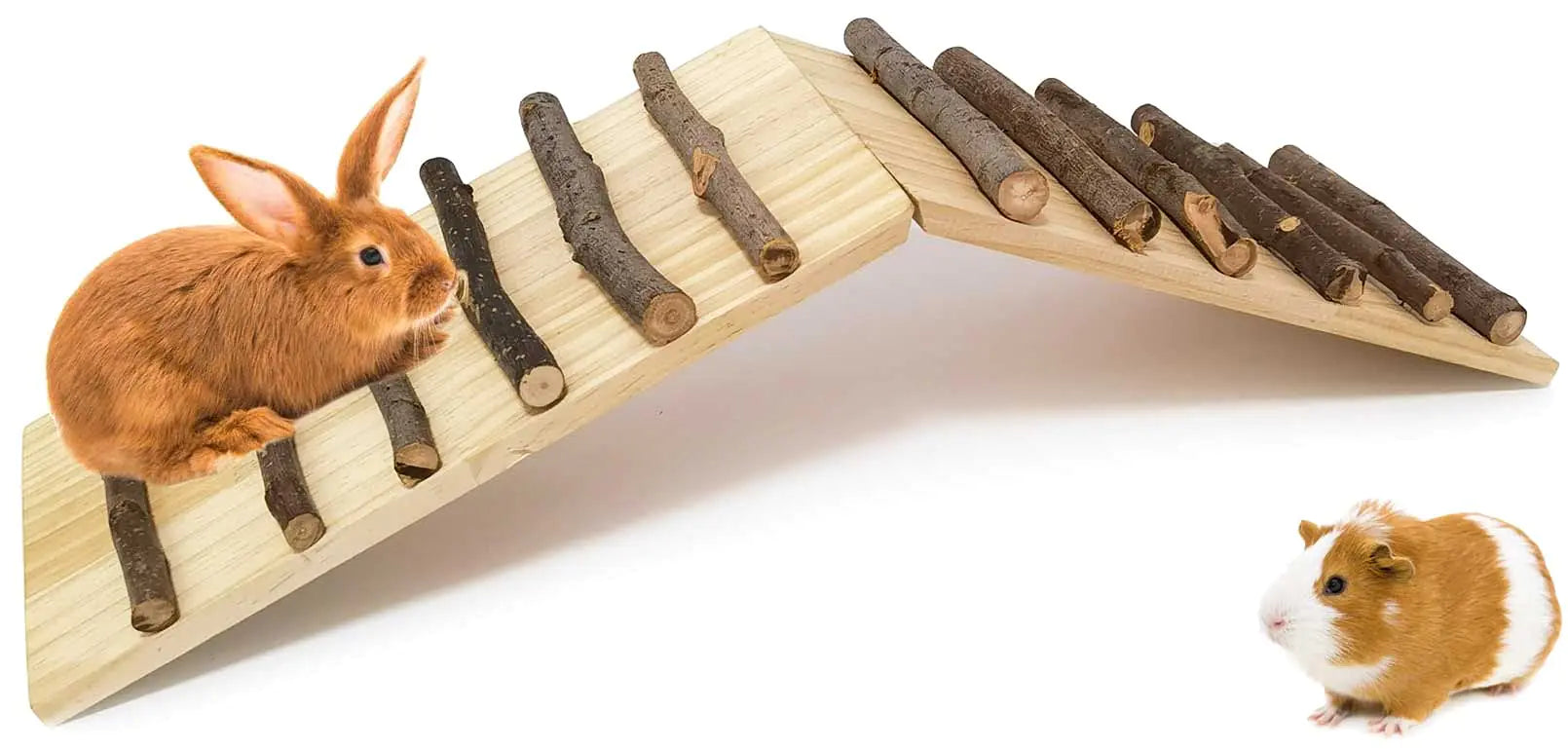 [[NATURAL WOOD] Our pet climbing bridge is made of natural wood strong and durable paint-free which is very safe for animals.This ramp helps pets reach the elevated areaencourages exploration and exercise.Stimulate your pets to climbing all over it run around it under it. More playing & exercising & less fighting "[PERFECT SLOPE TO CLIMB] The wooden cage bridge is gentle and not too steep which is a good protection for the small animals back.Pets climbing up and down the bridge can also reduce boredom and increase exercise.Our product not only provides more exercise opportunities for your little pet promotes movement and helps develop coordination and balance skills but is also suitable for your pet to chew satisfy her instinctive urges and help keep incisor teeth trimmed and healthy" [USEFUL CAGE ACCESSORIES] There is no need to install it just open it and put it in the cage or the door of the cage.Make it safer for your pet to get in and out of the cage.When the pet habitat is divided into different areas by the fence your cute pet can cross the fence safely through this ramp.Small animals can climb the slopes to eat hay in the higher areas and reach the higher platforms [RANGE OF APPLICATION] The rabbit ramp is recommended for rabbitsbunny hamstersmicegerbilsratsmousehedgehogssugar glidersdwarf hamsterssquirrelchinchillaguinea pigsferrets and other small animals.Offers pet mountaineering and exploration of desire. Can be used as a tunnel bridge or ramp.Pet exercise limbs force [PACKING AND SIZE] Each set contains 1 wooden bridge.The size of the wooden bridge when it unfolds is approximately 24.2"Lx6.5" Wx5.5 "H.Kindly tip: Before you buy this product you can measure the size to see if it fits your cage needs]