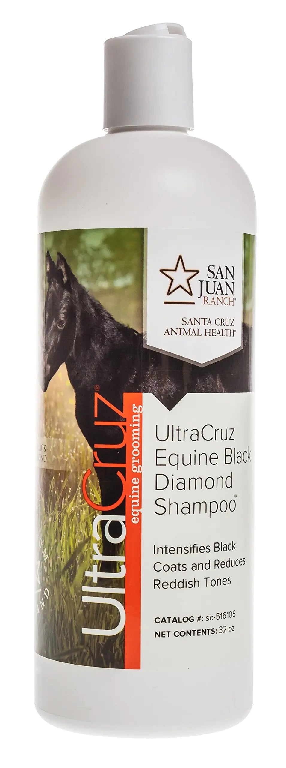 UltraCruz Black Diamond Shampoo intensifies black coats and reduces reddish tones often caused by sun fading in Dark Horses. This formula is gentle safe pH balanced and produces saturated rich color with brilliant highlights. The easy rinse formula is free of harsh chemicals and easily removes stains.