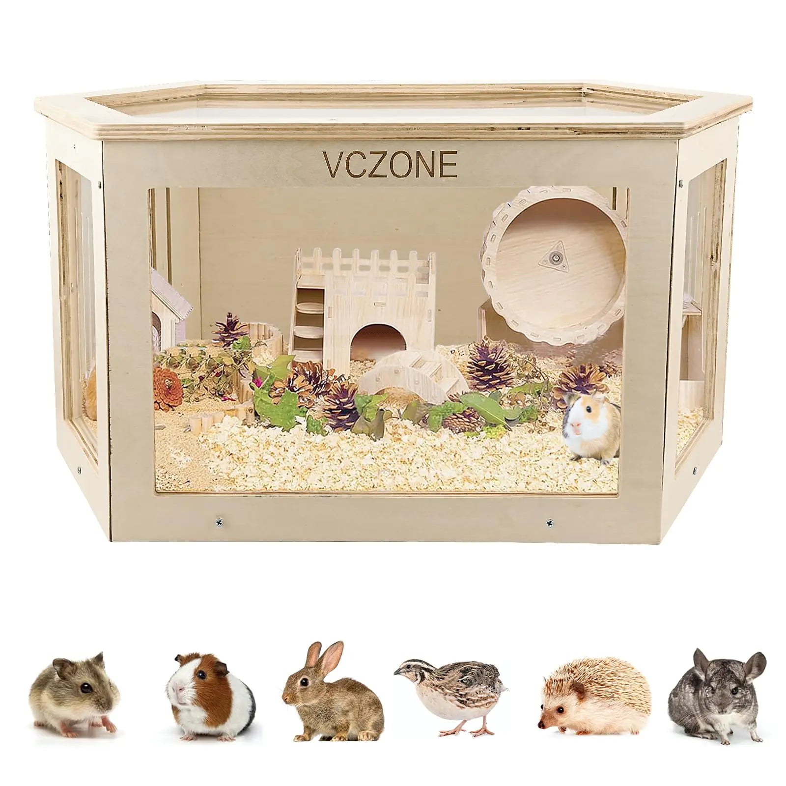 VCZONE Hexagonal Hamster Wooden Cage Acrylic Transparent Visible Design Hamster Cage for Hamster Guinea Pig Small Animal Wooden Cage Without Accessories 22X12X12